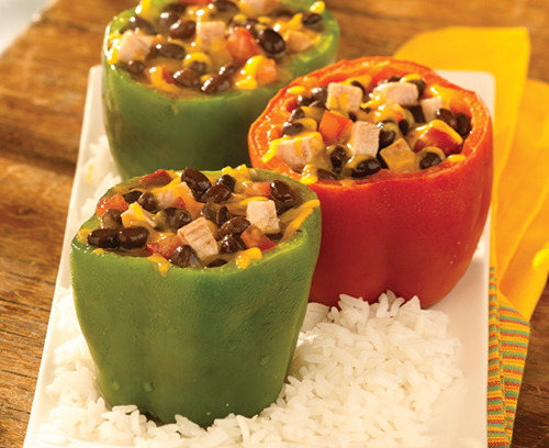 Meanwhile, in medium bowl, mix beans and sauce, turkey, cheese, tomato, chopped pepper tops and remaining 1/2 cup rice. Spoon bean mixture into peppers. Place in baking dish over rice. Cover tightly with foil.
