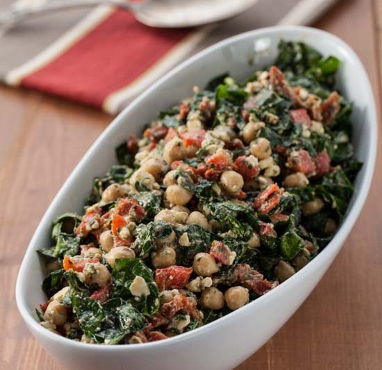 Regular spinach or baby spinach work equally well, just remove the stems from the regular spinach and tear the larger leaves. I haven’t tried it it with baby kale or chard, but I imagine both would also work nicely. I like this with home cooked beans, but a can of garbanzo beans will do in a pinch. When peppers are in season, roast your own in the oven or over a hot flame on the stove, or you can purchase roasted red peppers in jars.