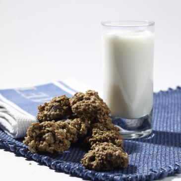 Add chocolate chips and oats and use wooden spoon to combine. Sift together flour and baking soda over wet mixture and stir until well combined.
