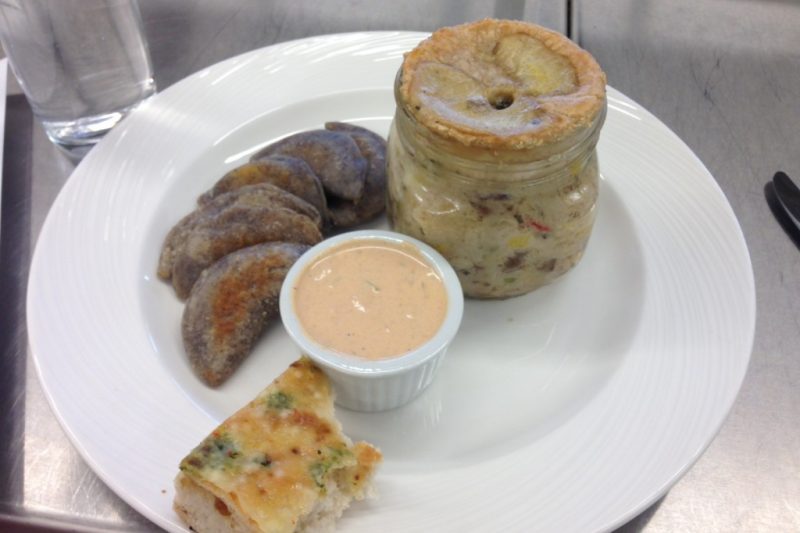 Using a bench scraper (or knife) cut a ¼ piece of the dough off and roll to approx. 1/16th of an inch thick. Cut rings out using a 2 inch pastry ring cutter. Place approximately 1/2 tbsp. of filling into the ring, rub water on the edge of the dough and press to seal. Crimp with a fork if if desired. Repeat until all filling and dough is used.