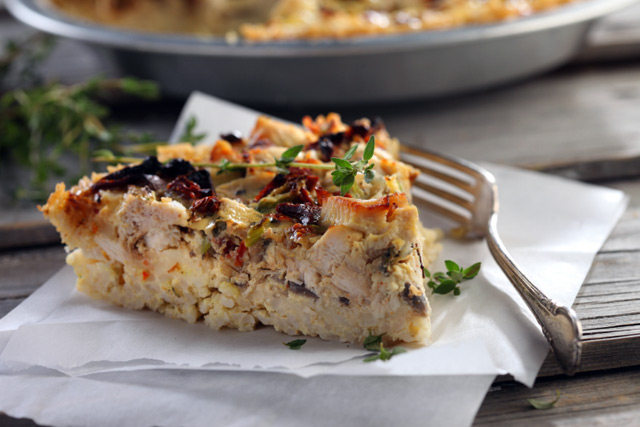 In a small frying pan, sauté mushrooms, sundried tomatoes and green onion with 2-3 tsp (10-15 mL) of canola oil. Set aside. Sprinkle cheese, turkey, black beans and sautéed vegetables into rice pie crust. In a medium bowl, beat eggs until just blended, and then mix in sour cream, milk, salt, basil, thyme, paprika, pepper, and cayenne. Pour into pie shell. Bake for 35 to 40 minutes, or until a knife gently inserted near the centre comes out clean.