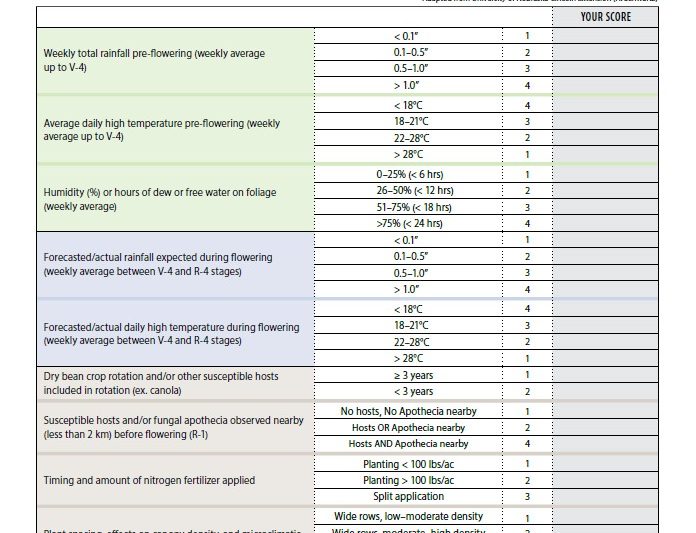 Use this worksheet for dry bean fields to assess the risk of white mould infection. The risk score along with yield potential and crop value can be used to aid in the decision of whether or not a fungicide application is required.