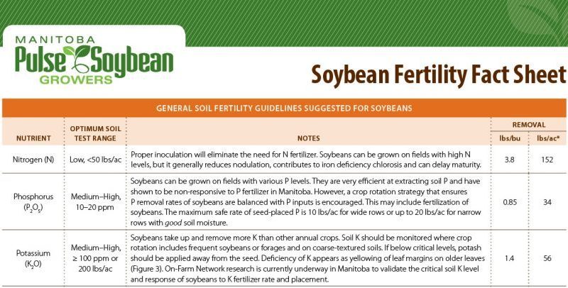 This fact sheet outlines general nutrient (N-P-K-S) recommendations for soybeans in Manitoba, inoculation strategies based on On-Farm Network research trials, and information to identify, manage and prevent iron deficiency chlorosis (IDC). This fact sheet was developed through the collaboration between specialists and researchers at Manitoba Agriculture, the University of Manitoba and Manitoba Pulse & Soybean Growers.