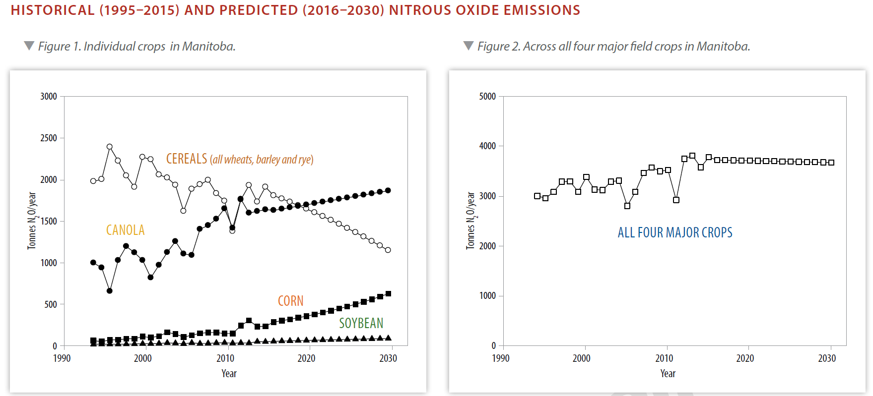 Increased emissions for canola in Manitoba is predicted because of greater rates of nitrogen addition for individual fields despite lack of increase in total acres planted. The increase in emissions from corn is due to both greater field application rates and more planting of the crop.