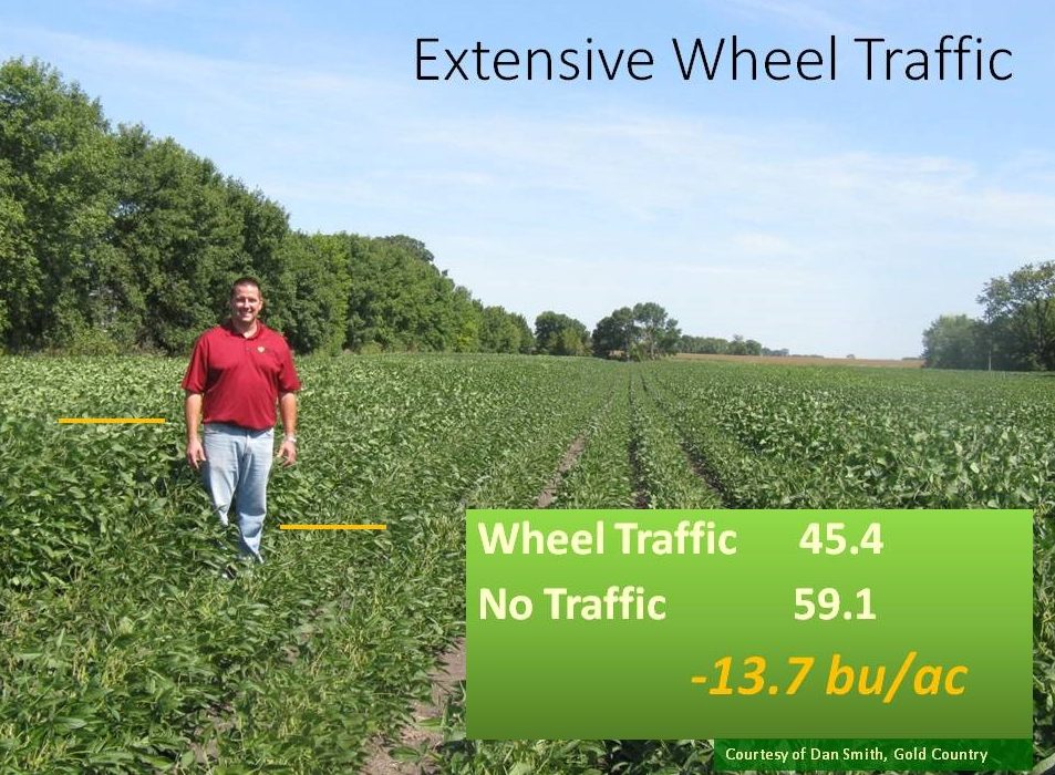 While scientific data on yield is limited, there is anecdotal evidence showing lower yields in soybeans due to extensive wheel traffic. One farmer in Minnesota noted an area of the field where he had cleared out a windbreak, causing heavy compaction, and the soybeans were less than half the height of the rest of the field (Figure 2). This resulted in a 13.7 bu/ac decrease in soybean yields between no traffic (59.1 bu/ac) and wheel traffic (45.4 bu/ac) strips in his field. The yield loss was not that high considering the dramatic differences in plant height.