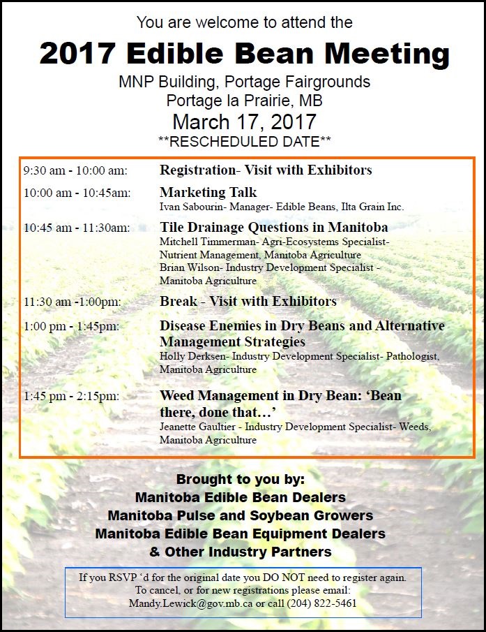 Events2017 Edible Bean Meeting The 2017 Edible Bean Meeting in Portage la Prairie has been rescheduled for March 17th. RSVP to Mandy Lewick if you haven’t yet registered or cancelled your previous registration. Walk-ups welcome.