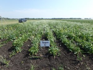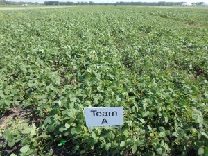 All soybeans are at the R2 stage of development. Soybean management strategies can be visually distinguished one from another due to differences in row spacing and weed control. Team C plots have had five rounds of inter-row cultivation, but weeds such as volunteer tillage radish and thistle are present in high numbers within rows.