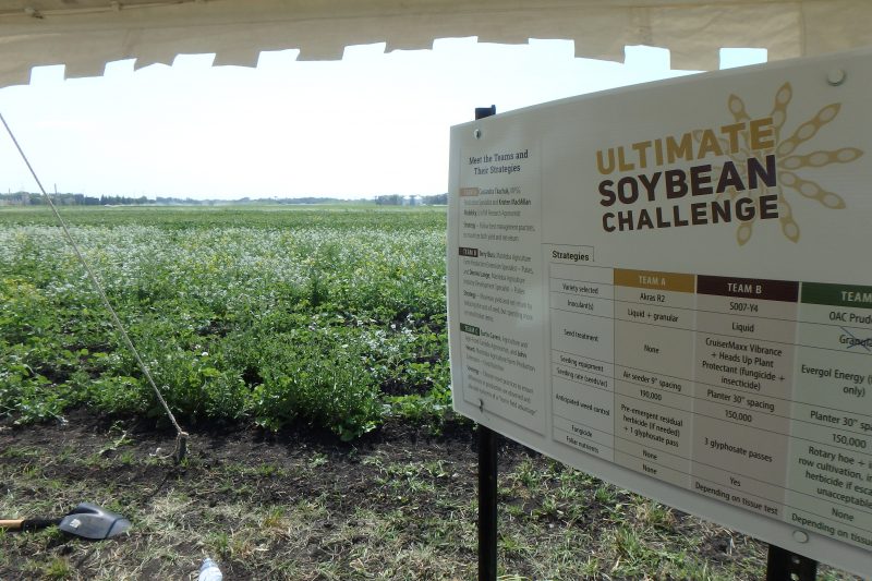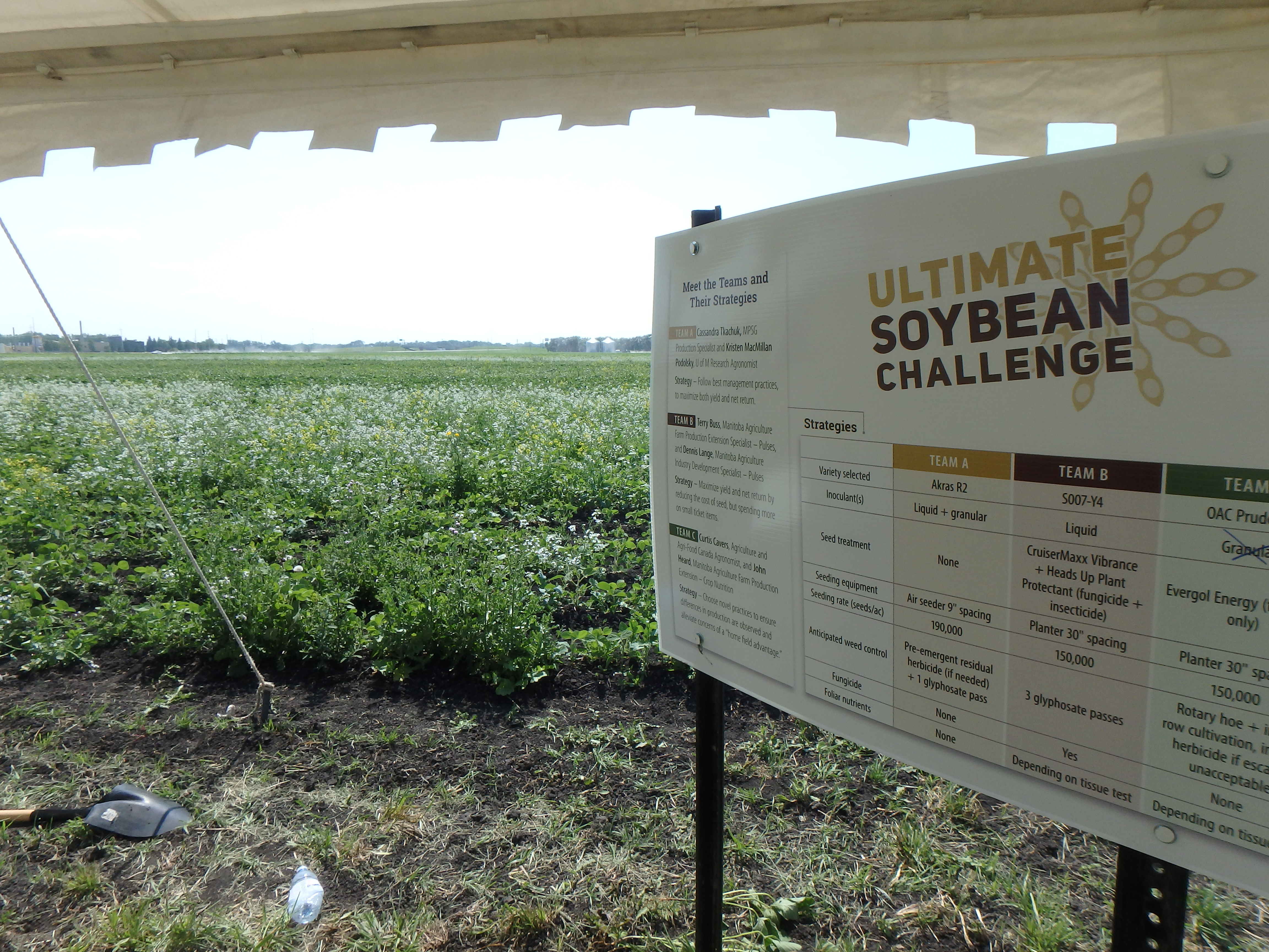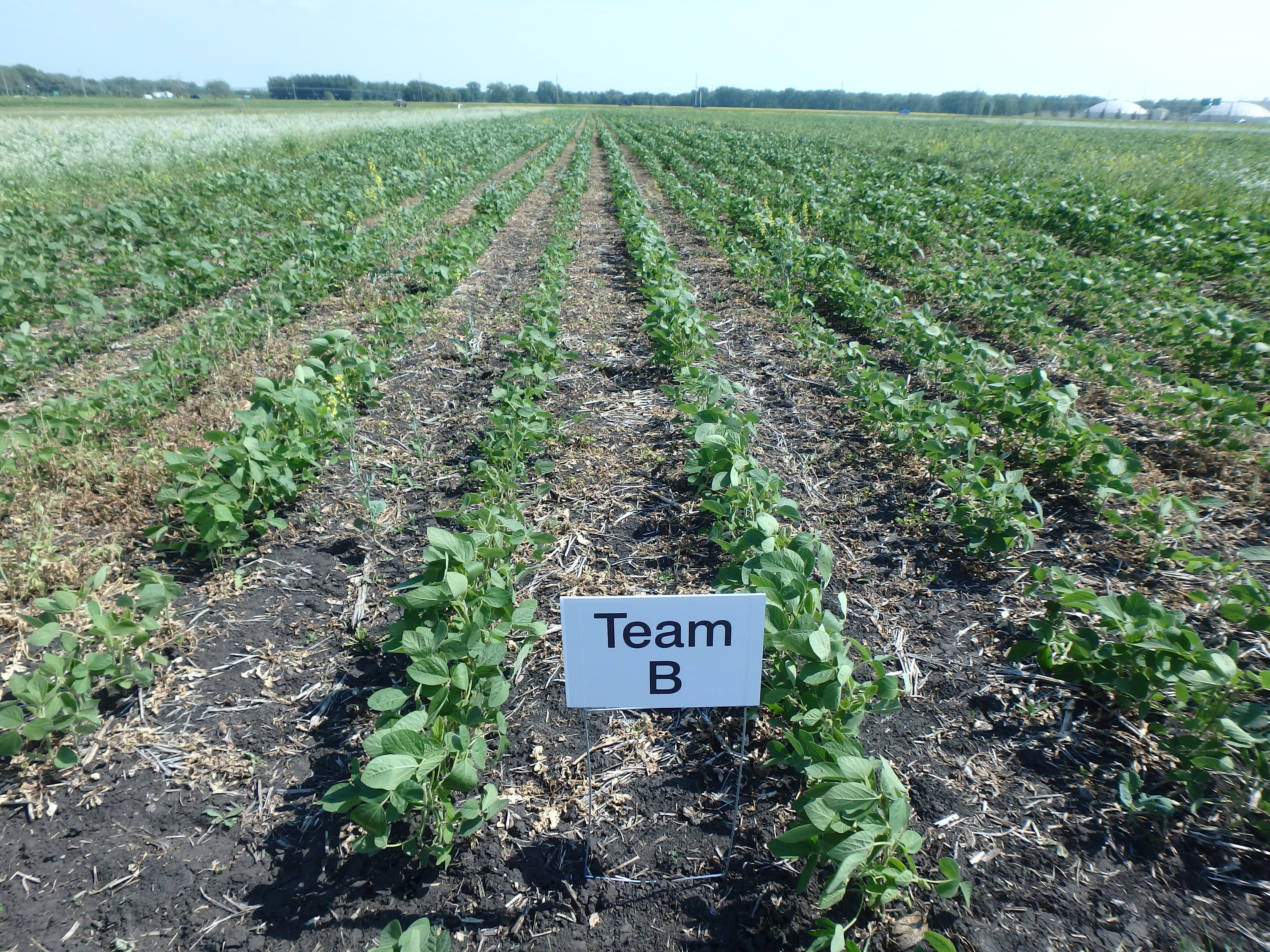 All soybeans are at the R2 stage of development. Soybean management strategies can be visually distinguished one from another due to differences in row spacing and weed control. Team C plots have had five rounds of inter-row cultivation, but weeds such as volunteer tillage radish and thistle are present in high numbers within rows.