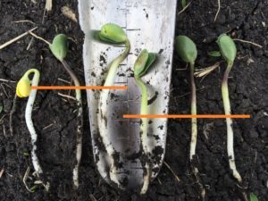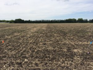 Surface dried up but very good soil moisture. All treatments are emerging with no clear differences. It was expected that the shallower seeding depth would emerge sooner but soil depth appears deeper than anticipated in all treatments (see picture). Emergence is estimated at 50% and counts will begin in early June. Main weeds are millet and dandelion.