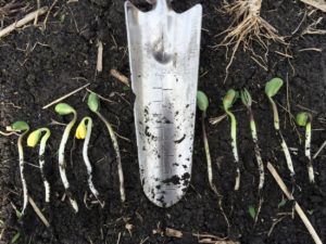 Surface dried up but very good soil moisture. All treatments are emerging with no clear differences. It was expected that the shallower seeding depth would emerge sooner but soil depth appears deeper than anticipated in all treatments (see picture). Emergence is estimated at 50% and counts will begin in early June. Main weeds are millet and dandelion.