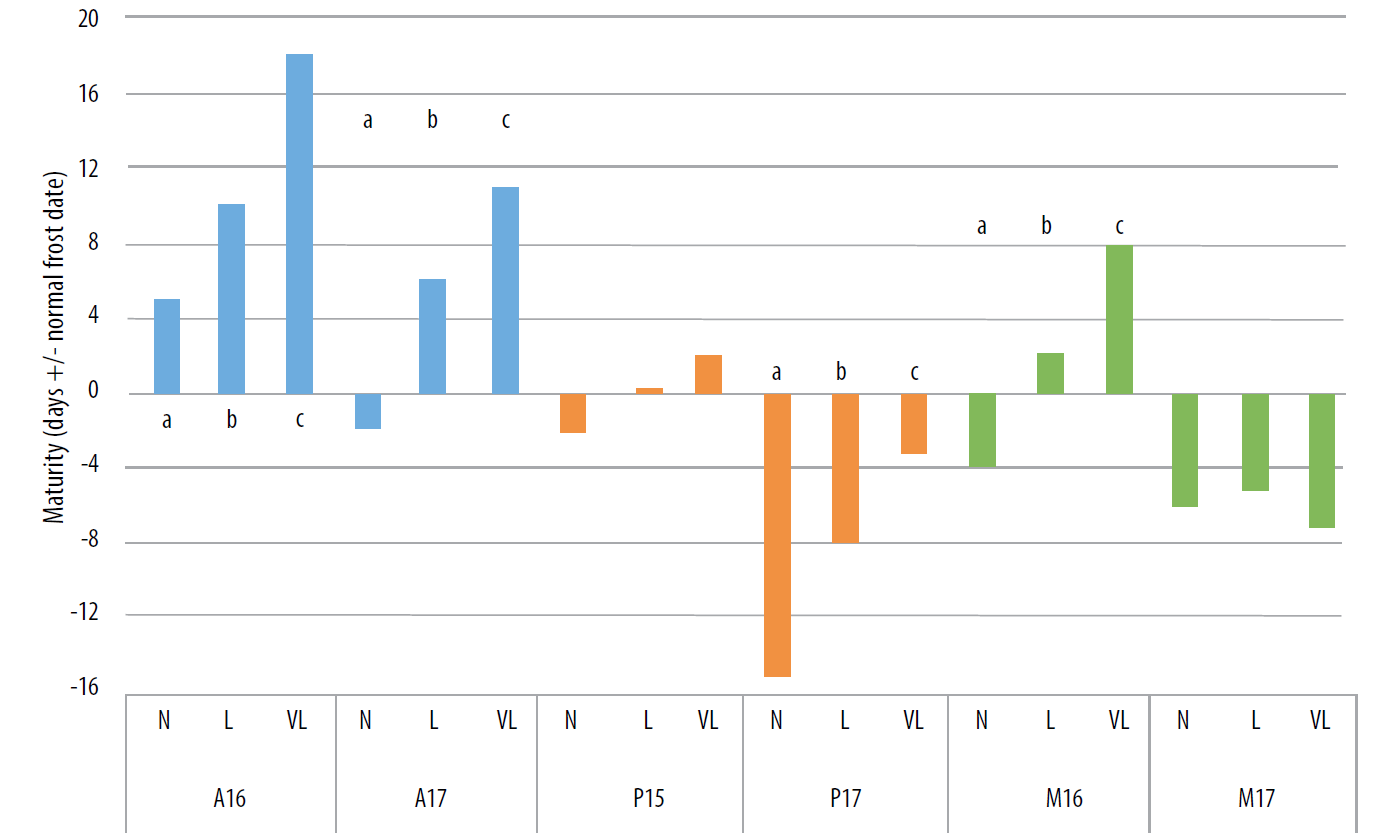 At both Portage site-years, soybeans matured within at least one day of the normal frost date regardless of seeding date. At Morden in 2017, all soybeans matured prior to the normal frost date but in 2016, late- and very late-seeded soybeans matured beyond the normal frost date, which can be explained by delayed seeding. As expected, Arborg showed the highest risk with seeding soybeans late; there, soybeans matured 5+ days after the normal frost date and at Arborg in 2017, two of the varieties planted at the very late seeding date did not mature.