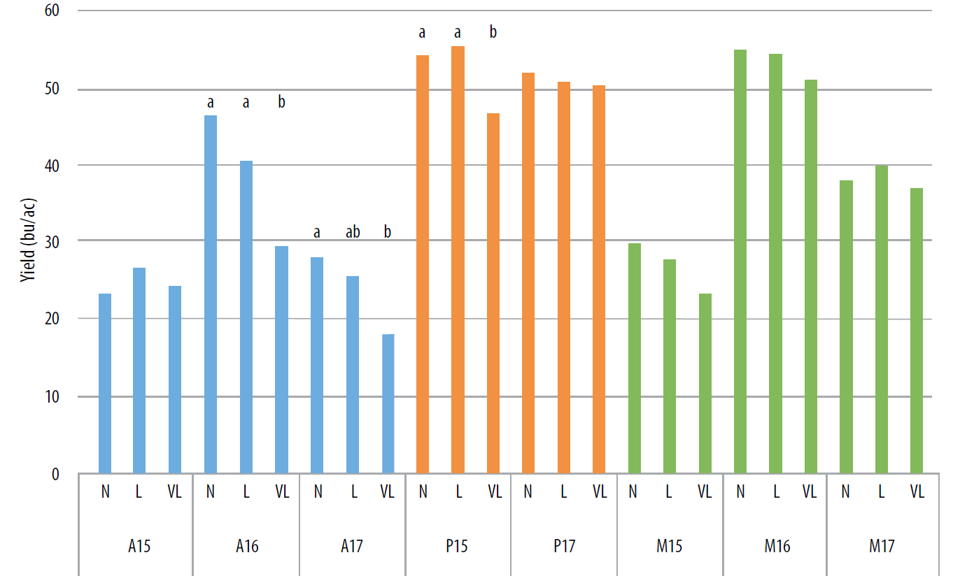 Yield of soybeans was most strongly affected by site-year, and ranged from 24–53 bu/ac. The effect of seeding date and variety on yield sometimes varied by site-year. Overall, the very early variety and very late seeding date tended to reduce yield.
