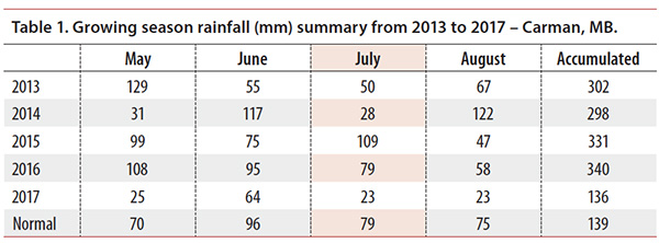 July is when dry beans begin to flower, and most foliar fungicide applications are applied. Comparing July rainfall from 2013 to 2017, there were two years where the rainfall was considerably below normal, 2014 and 2017 (Table 1). In these years, we did not see a response to foliar fungicide. In 2013, 2015 and 2016, rainfall was either slightly above or below normal. We observed a significant response to foliar fungicide in 2013 and 2015, but not in 2016.