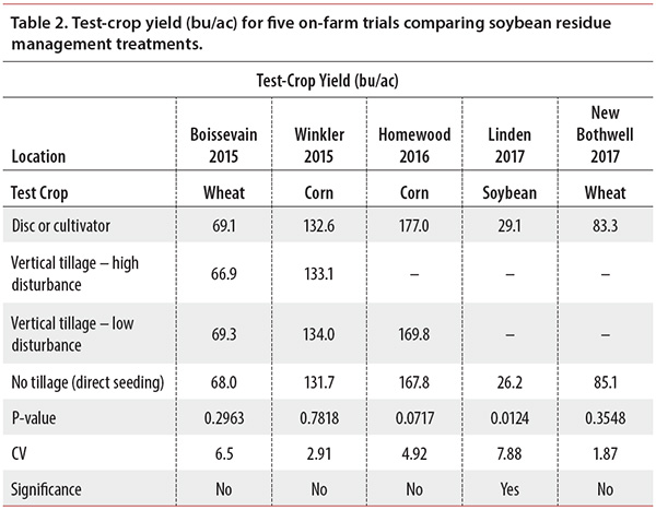 Despite the different tillage tools used, there were few differences in test-crop performance between the soybean residue management treatments compared in this project.