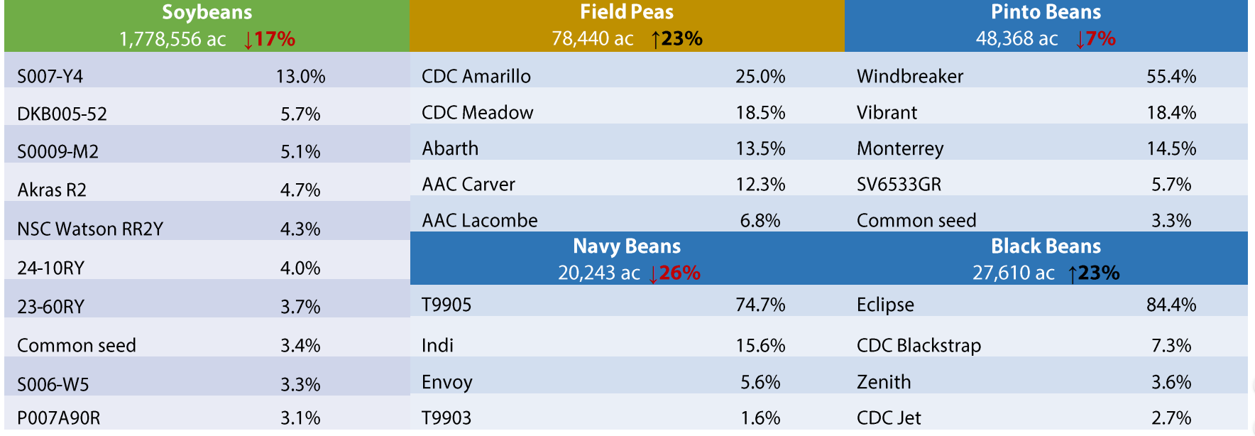 Table 1. Manitoba pulse and soybean acres in 2018, percent change from 2017 and percentage of the variety market share in 2018. Source: MASC