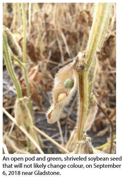 Green soybean seed can become an issue when dry conditions occur from July to August. These conditions prevent the enzyme, chlorophyllase, from degrading chlorophyll in the seed (i.e., the process that allows normal colour change). Learn how this impacts grading, and what you can do about it here.
