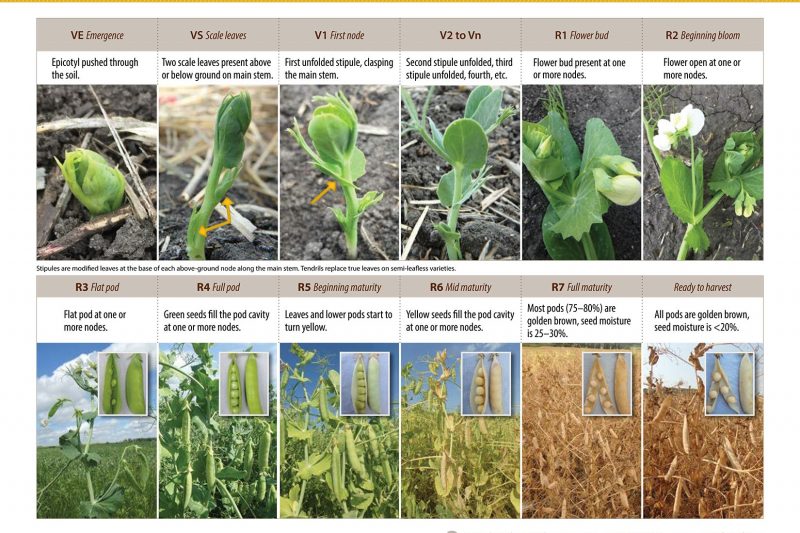 This visual guide was created to assist farmers and agronomists with identifying field pea growth stages. Proper identification of growth stages is important for scouting and crop management, such as plant stand assessment, product application and harvest timing.