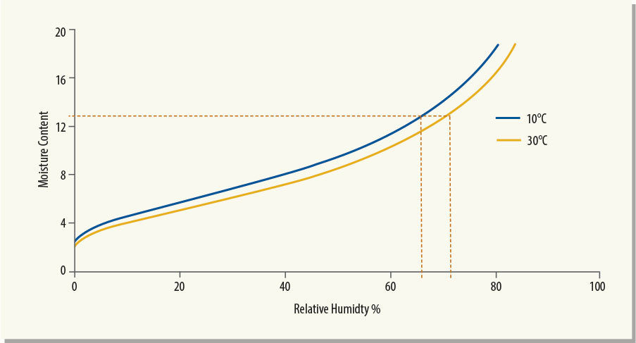 Figure 2. Comparison of the relative humidity of soybeans at 13% moisture content stored at 10°C and 30°C. Storage at high temperature results in higher relative humidity, which should be avoided to prevent soybeans from spoilage.