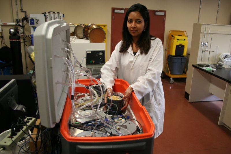 Figure 1. Bioystems Engineering MSc student, Lina Diaz Contreras, putting soybean samples in her custom-designed EMC-ERH chamber at the Grain Storage Research Lab (University of Manitoba).