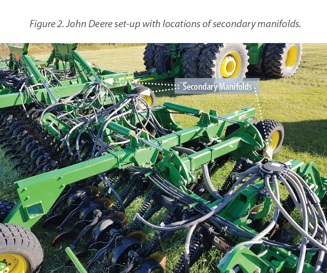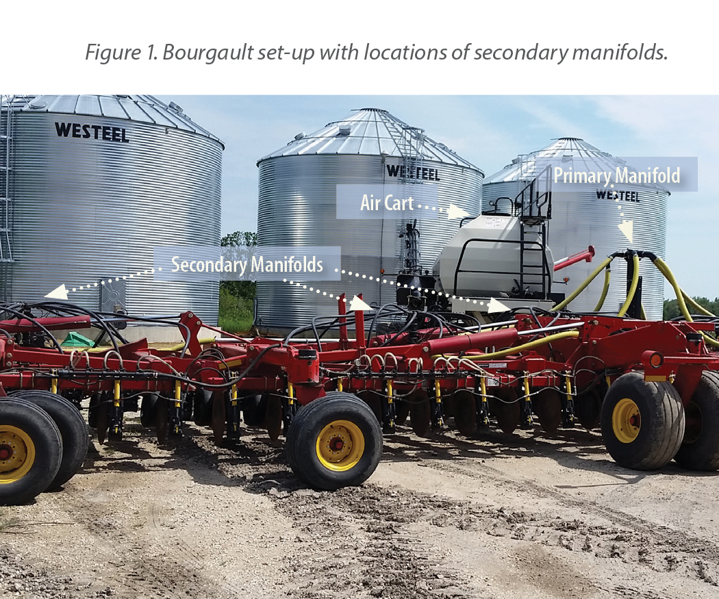 The purpose of this study was to evaluate the consistency of distribution in large air seeders (60 feet in width) and the effect of fan speed on distribution and seed damage. Two configurations of 60-foot seeders (Bourgault and John Deere) were chosen for analysis due to their popularity in Manitoba (Figures 1 and 2). Both air seeders were owned by local farmers and used over six to seven seeding seasons. Some modifications to the air seeder distribution system and hoses were made by the owners over time. Because the systems tested were used, new equipment may produce different results.