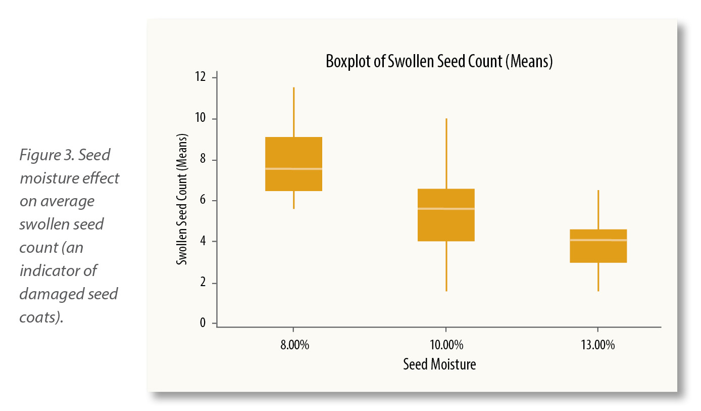 All three moisture contents were significantly different from each other. This is shown in Figure 3 where the middle horizontal line of each box represents the average swollen seed count for each moisture content. Soybean seeds with 13% moisture performed significantly better than seeds with 8 and 10% moisture. Seeds with 8% moisture showed significantly higher seed coat damage among the three seed moisture conditions used in the test. The effects of fan speed and manifold position on the swollen seed results were not statistically significant.