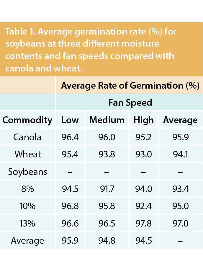 Fan speed did not have an effect on germination in the John Deere trials, but lower fan speed resulted in higher germination in the Bourgault trials for soybeans. Fan speed had no effect on germination for smaller-seeded canola or wheat. Combining results across trials, higher moisture soybeans were shown to have higher germination than lower moisture soybeans. This indicates that in practice, lower fan speeds and higher moisture soybeans should be used where possible to reduce seed damage.