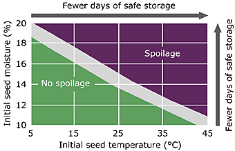 - Spoilage: As the peas enter the bin, measure the grain temperature and moisture. If the initial temperature and moisture are within the “no spoilage” zone of Figure 3, grain can be safely stored for up to five months. A general recommendation is to use aeration fans to cool and dry the crop to at least 16% moisture and 15°C.
