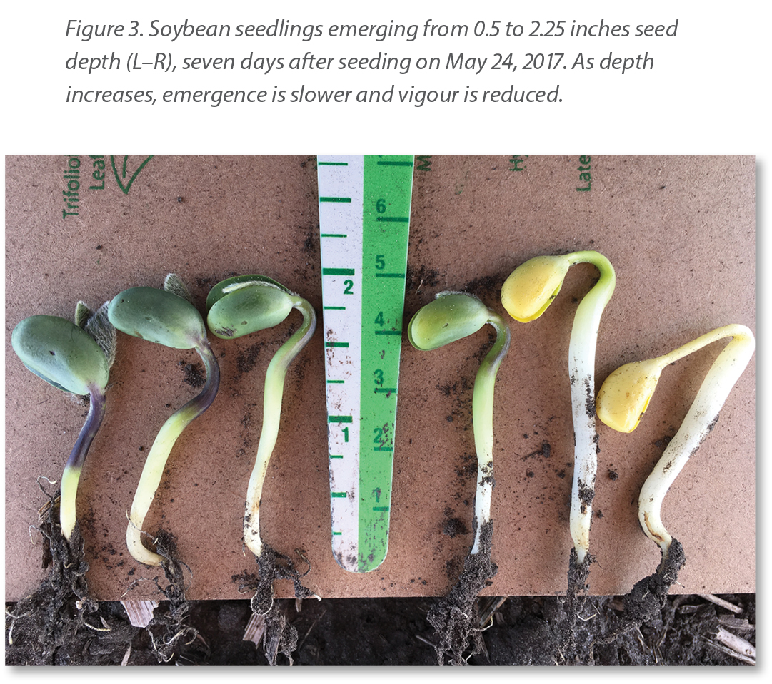 Soybean seeding depths between 0.25 and 2.25 inches were tested at Arborg (clay soil) and Carman (loam soil) in 2017 and 2018. Trials were seeded between May 14 to 24 into dry soil conditions, much like many crops these past two years.