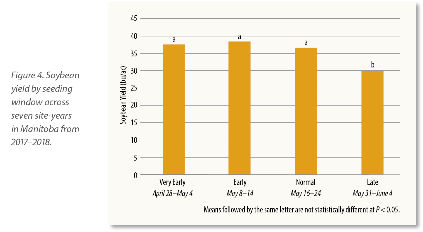 Overall, soybean yields ranged from 21–40 bu/ac in this study, except for Dauphin in 2018, which yielded an incredible 64 bu/ac. Preliminary results show that the seeding window that optimized yield varied by environment. However, I am going to present the overall main effect of seeding date because the trend was present in each environment. Overall, seeding within the first three weeks of May optimized yield (Figure 4). There is no clear recommendation to seed soybeans as early as possible, which we hear from southern growing regions.