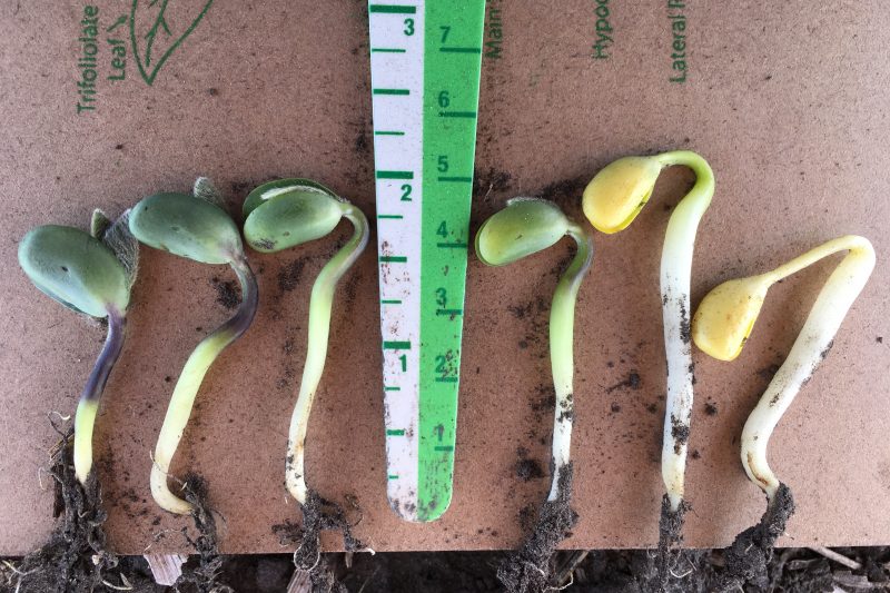 There is a visible impact of deep seeding on soybean seedlings – they emerge slower and symptoms of hypocotyl swelling and chlorosis are evident, leading to reduced seedling vigour (Figure 3). Seeding soybeans too shallow (0.25 inches) are also more prone to moisture fluctuations, resulting in wetting and drying of the seed which leads to poor germination and establishment. To identify other mechanisms contributing to yield differences, we measured the effect of seed depth on pod height in 2018 and we plan to measure nodulation and root rot in 2019, which will be the last year of the study.