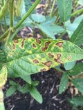 Anthracnose is less common in Manitoba-grown soybeans. It appears as reddish-brown irregularly-shaped blotches on the leaves, stems and petioles. Black fungal bodies develop in these blotches later in the season. Leaf symptoms include reddish veins. Leaf petioles may also become twisted and bent into a Shepherd’s crook, resulting in early defoliation.
