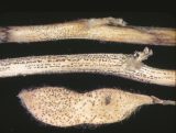 Charcoal rot appears as a light-grey or silver-coloured lower stem and taproot. When stems are split, black streaks will be present in the woody portion of the stem. This disease also produces tiny, black fungal structures (microsclerotia) throughout affected areas of the plant, giving the tissue a charcoal-like appearance.