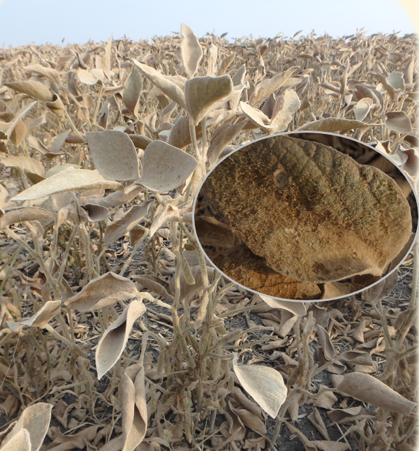 This soybean discolouration that appears bronze/red from afar is a severe infestation of spider mites. These symptoms were found in small, isolated patches near field edges in Manitoba in 2017.