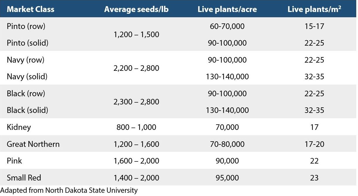 - Target plant stand (live plants/ac) varies depending on dry bean market class and row spacing.