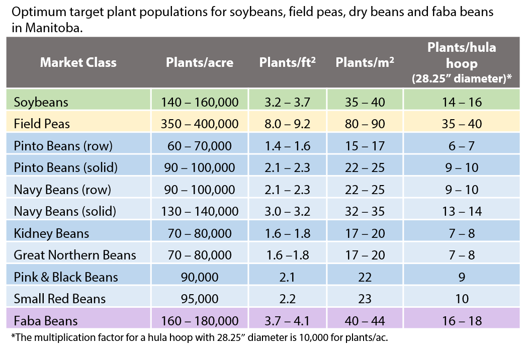 Optimum target plant population for field peas is 350-400,000 plants/ac. Use the MPSG Bean App Plant Stand Assessor tool to calculate and compare plant populations in your field with the optimum target plant populations for pulses and soybeans.