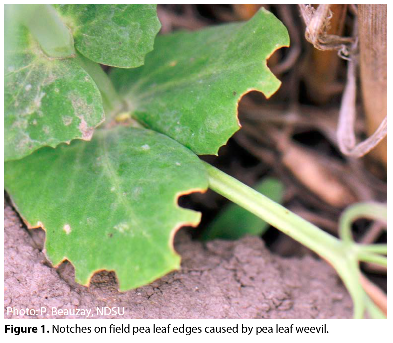 Though pea leaf weevil has not been found in Manitoba yet, the best time to look for potential damage is at the end of May to early June. Pea leaf weevil feeding appears as leaf notching in field pea and faba bean plants.