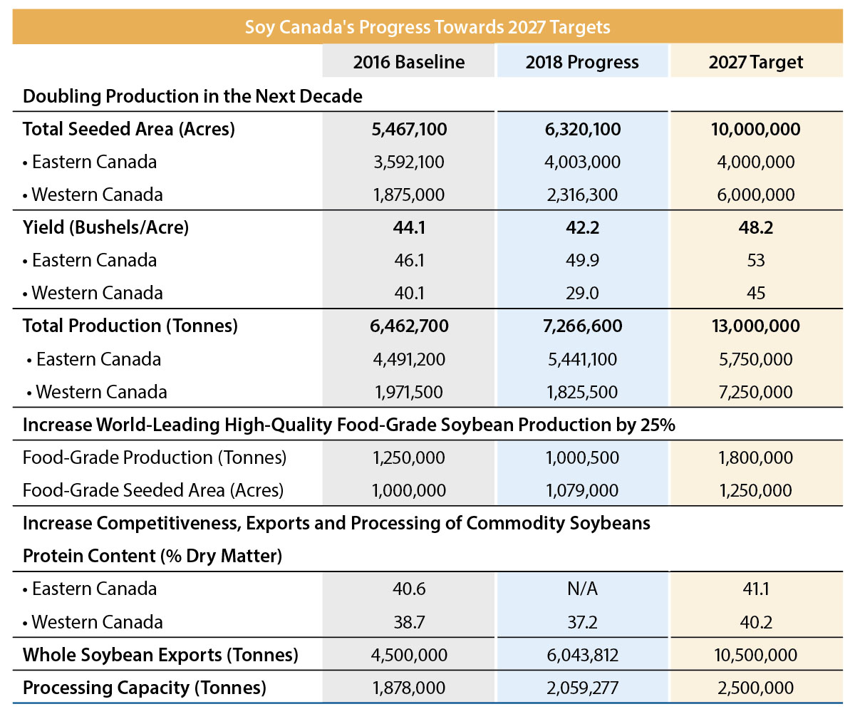 The table below outlines Soy Canada’s progress towards 2027 targets as outlined in the Strategic Plan.