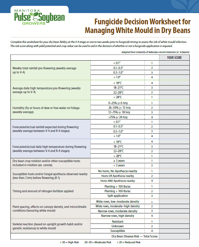 The Fungicide Decision Worksheet for Managing White Mould in Dry Beans (also available in the Bean App) was created to help determine the risk of white mould disease development, based on environmental and agronomic factors.