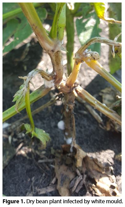 The main disease controlled by fungicide in dry beans is white mould (Sclerotinia sclerotiorum) (Figure 1). Fungicides can also offer control or suppression of anthracnose, powdery mildew and rust, depending on the product. However, these diseases are less frequent and less severe in Manitoba-grown dry beans. White mould has a wide host range, infecting other broadleaf crops such as canola, soybeans and sunflowers.