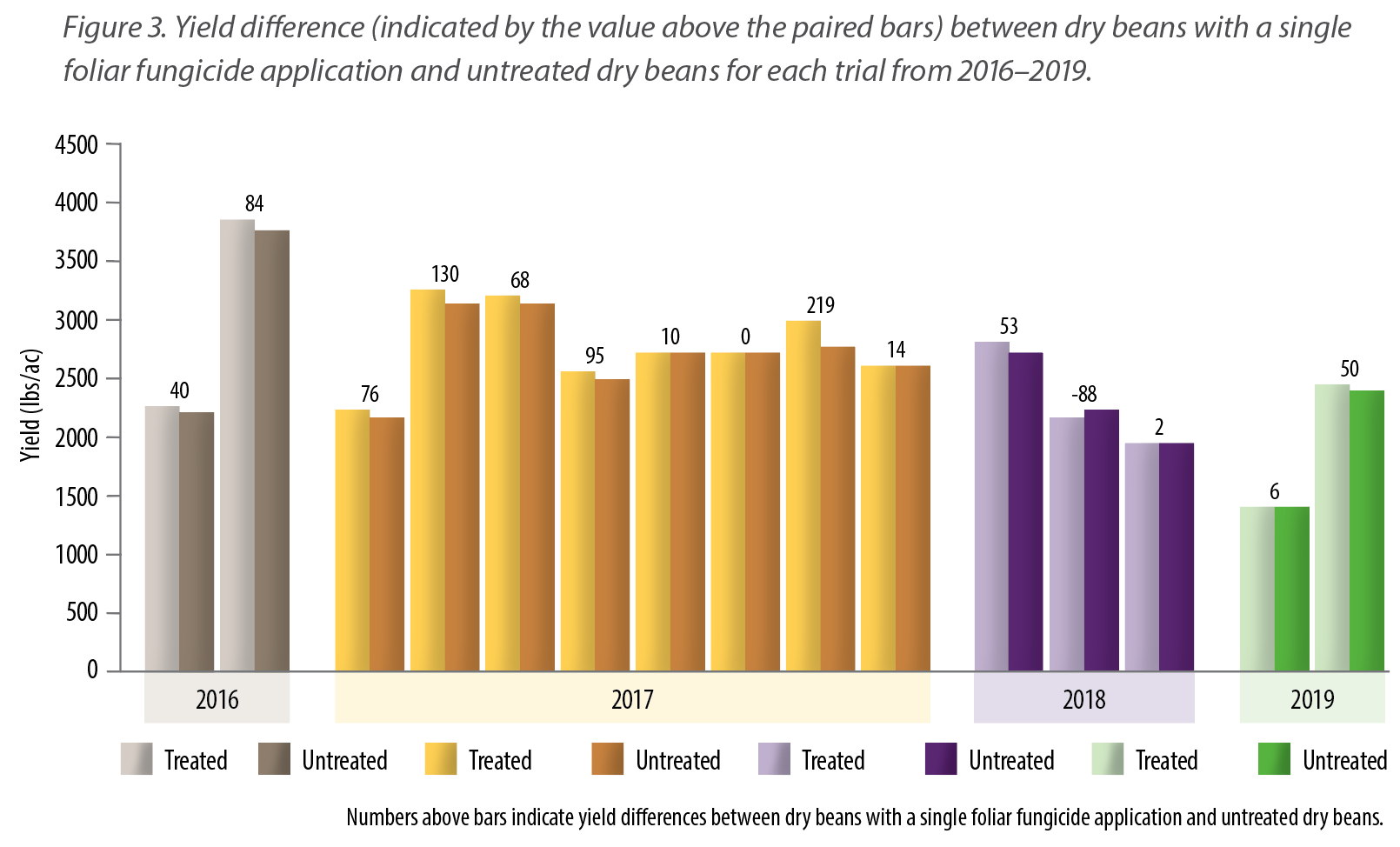 Since 2016, 14 replicated and randomized trials have been conducted to evaluate foliar fungicide application in dry beans through the On-Farm Network. White mould and anthracnose are the disease targets of foliar fungicide in dry beans, but white mould is the main concern. Anthracnose was not found during the 2020 survey and has not been a recent issue for dry beans due to variety resistance.