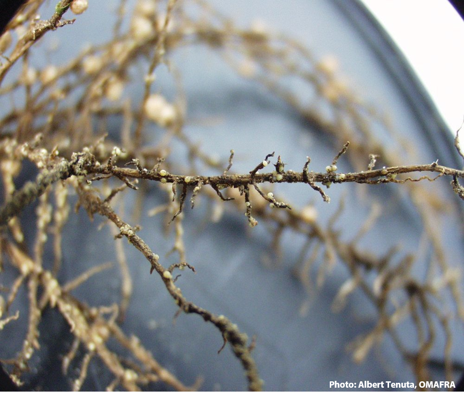 Add soybean cyst nematode (SCN) to your scouting watch list at this stage in the growing season. It can be tricky to scout for since symptoms of SCN may resemble other plant stressors, such as nutrient deficiencies and drought stress. To make it even trickier, plants may still appear healthy at low levels of infection. Our best recommendation is to dig and investigate soybean roots in suspect areas (field approaches, low spots, high pH spots) for the tiny, white, lemon-shaped cysts of SCN. Note that these cysts are much smaller than root nodules.