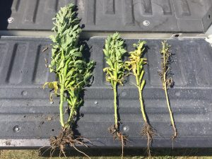 - Salinity – In addition to increasing the risk of IDC, soybeans and pulse crops do not like saline conditions in general. Saline conditions can stunt growth and turn plants yellow. Given the ongoing dry conditions, we are not surprised to see the impact of salinity across Manitoba.