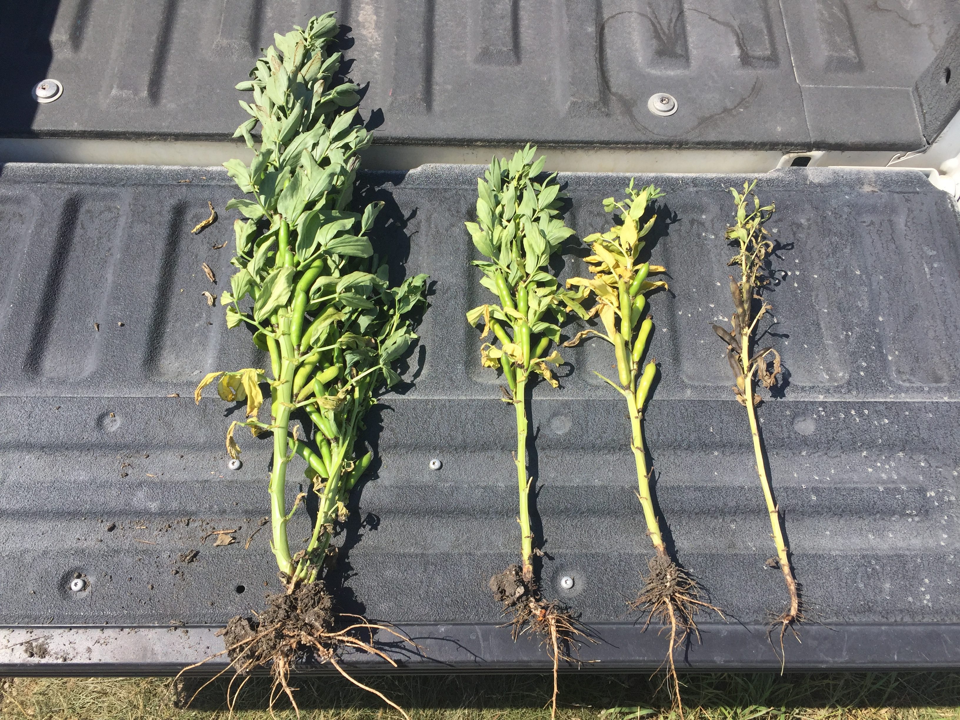 Faba beans range from the R6 (beginning maturity) to R7 (mid-maturity) stages. Rain-fed faba beans are more advanced than irrigated crops under these dry conditions.