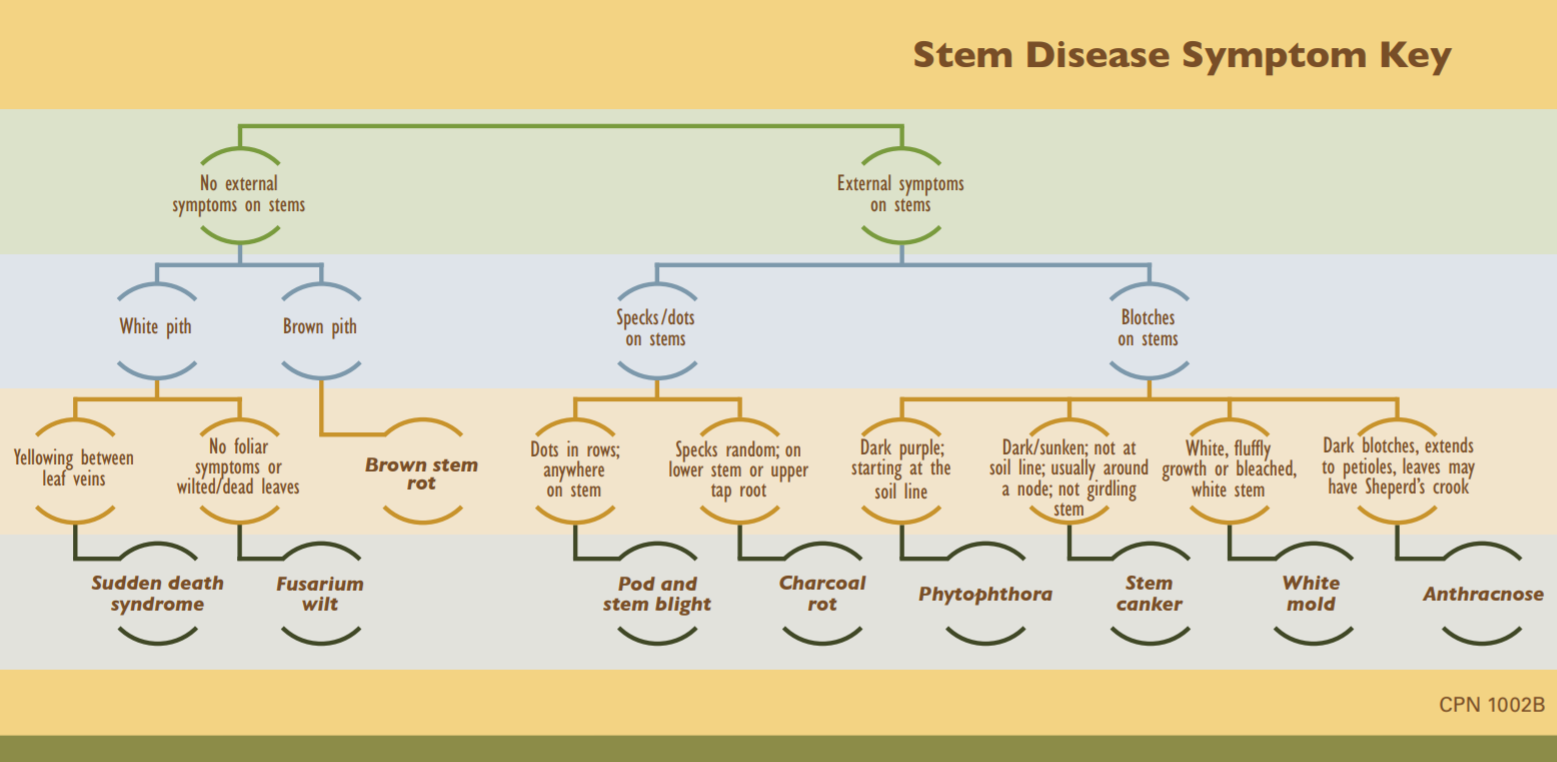 Stem and root diseases can have a greater impact on soybean yield and quality than foliar diseases. Symptoms typically arrive later in the growing season during reproductive stages, which can directly impact pod and seed production. The most prevalent and economically important diseases in this category are white mould (Sclerotinia) and Phytophthora. However, there are a few others to keep an eye out for, including those that have not yet been confirmed in Manitoba.