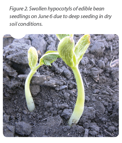 Spring started with slow seedling emergence due to both cool and dry conditions. Scouting in May consisted mainly of seeding depth assessments as we patiently waited for pulses and soybeans to emerge. Dry soil at seeding again tempted farmers to push the boundaries on seed depth to access precious moisture. Yellow cotyledons and swollen hypocotyls (Figure 2), the stress symptoms of deep seeding, were a common sight this past spring as in the previous two years. Delayed and non-uniform emergence was also common, where seeds that were either placed very shallow or placed very deep, emerged later.