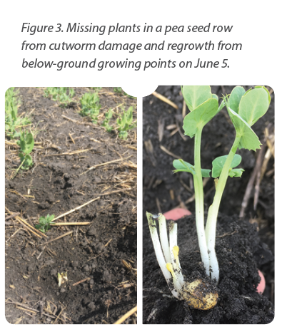 Another thing we will remember about 2019 was the insect pressure. For pulse and soybean crops, the main culprits were cutworms and grasshoppers. It seems that we saw more cutworm and grasshopper pressure than ever in these crops. Several crops were sprayed more than once, some were reseeded and crops like peas and faba beans showed their ability to regrow following cutworm damage (Figure 3).