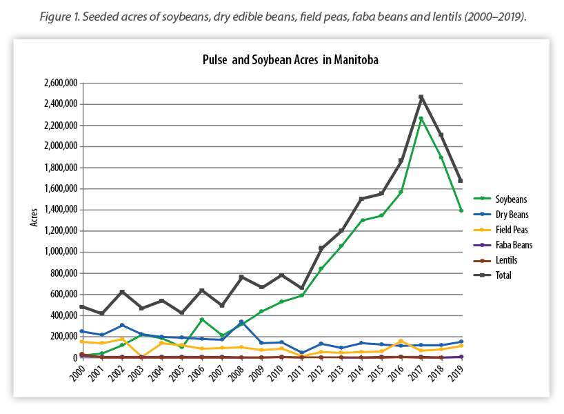 In 2019, 1.39 million acres were seeded to soybeans in Manitoba. That marks a decline by approximately 504,000 acres from 2018. This is also the second drop in acres since soybeans peaked at 2.26 million in 2017 (Figure 1). However, soybeans are holding strong, still ranking as the third-largest crop in Manitoba.