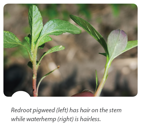While the description of waterhemp does not sound at all like redroot pigweed, as small plants, they can look very similar. Two differentiators that are mainly used to identify waterhemp versus redroot pigweed are hairs on the stem and the seed head.