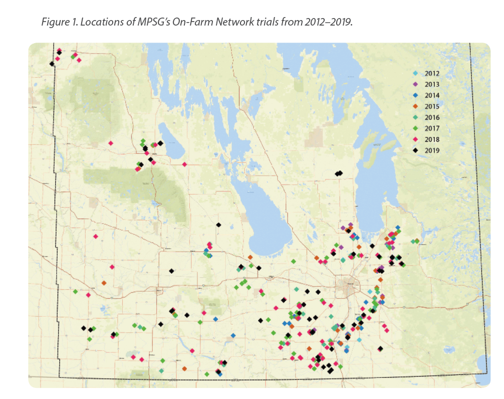 Manitoba Pulse & Soybean Growers (MPSG) began funding on-farm research trials back in 2010. In 2014, MPSG made a commitment to expand its on-farm research program throughout the province, and in April of 2014 MPSG’s On-Farm Network (OFN) was officially launched. The OFN is a network of pulse and soybean research conducted on-farm, fully funded and directed by pulse and soybean producers in the province. The goal of the OFN is to test new products and practices for pulse and soybean production while empowering farmers to conduct straightforward, reliable research on their farms. Three principles guide the OFN: