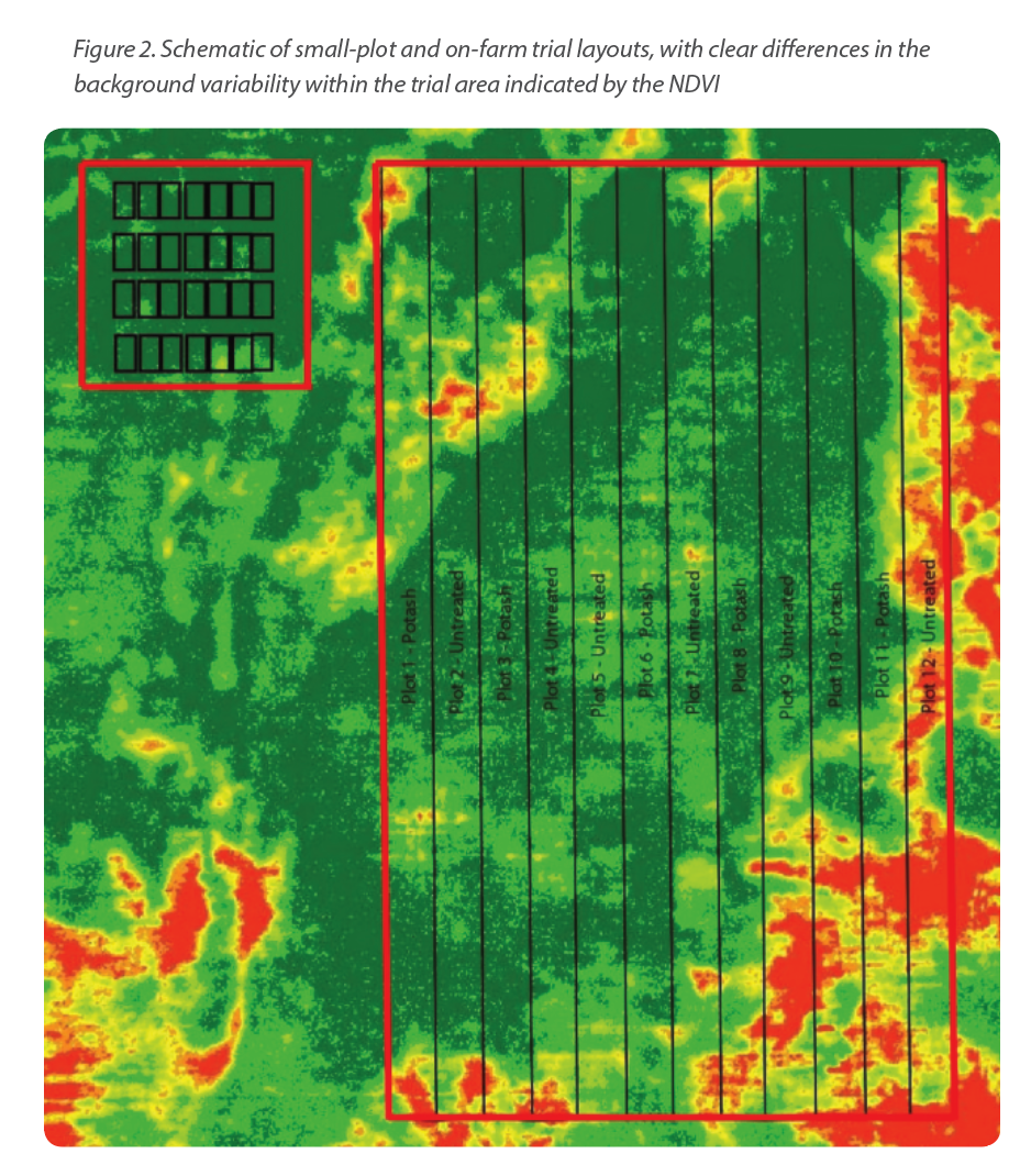 On-farm trials are large, field-scale trials established with field-scale equipment by the farmer. Unlike small-plot trials which have a lot of treatments in a small area, on-farm trials compare just a couple of treatments but over a much larger area. The difference in scale between small-plot and on-farm trials results in differences in background variability across the trial area (Figure 2). Small- plot researchers generally want very uniform site areas. However, in on-farm research we want to capture as much representative field variability as possible to determine how a treatment behaves at the scale it would be applied if it were to become normal farm management practice.